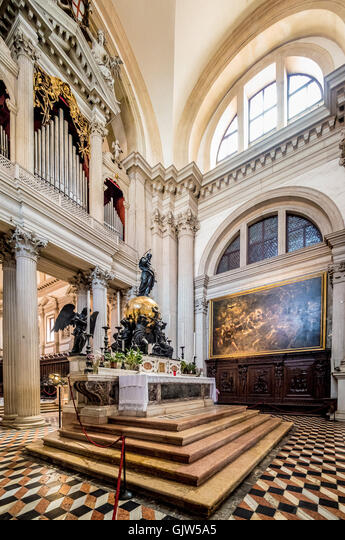 El interior es de nave única, con imponentes y decoradas capillas laterales. Tiene un simple transepto constituido de tres ábsides, desde donde se alza la gran cúpula central. Gran importancia tiene la luz, como en todas las obras de Palladio, y es la verdadera protagonista del interior, valorizando los volúmenes y la decoración.