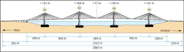 El puente de Río-Antirio consta de 3 puentes atirantados sucesivos con un vano central de 560 m cada uno. El tablero continuo de 2.250 m de los tres puentes atirantados es el más largo del mundo.