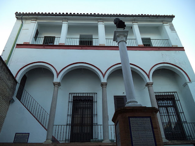 | Un edificio de la Santa Caridad. Una placa explica que esa escalera comunica directamente la Iglesia con los aposentos que ocupó en los últimos años de su vida Miguel de Mañara. Este mandó construirla para facilitar sus visitas al "augusto sacramento del Altar". En la plaza se encuentra un monumento de 1920 que consiste en una columna coronada por un busto de bronce del venerable. Caballero y filántropo español. La leyenda creada en torno a él, con una juventud desordenada y una posterior conversión, llegó a identificar su figura con la de don Juan Tenorio. |