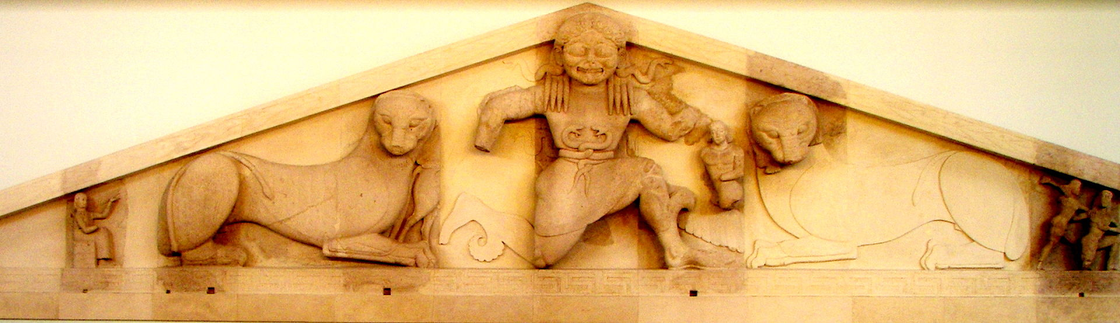 La gorgona, flanqueada por leonas y mostrando su cinturón de serpientes, tal como aparece en el frontón del templo del siglo VII a. C. expuesto en el Museo Arqueológico de Corfú. --- Se trata de una de las más antiguas expresiones de escultura en un frontón de Grecia.