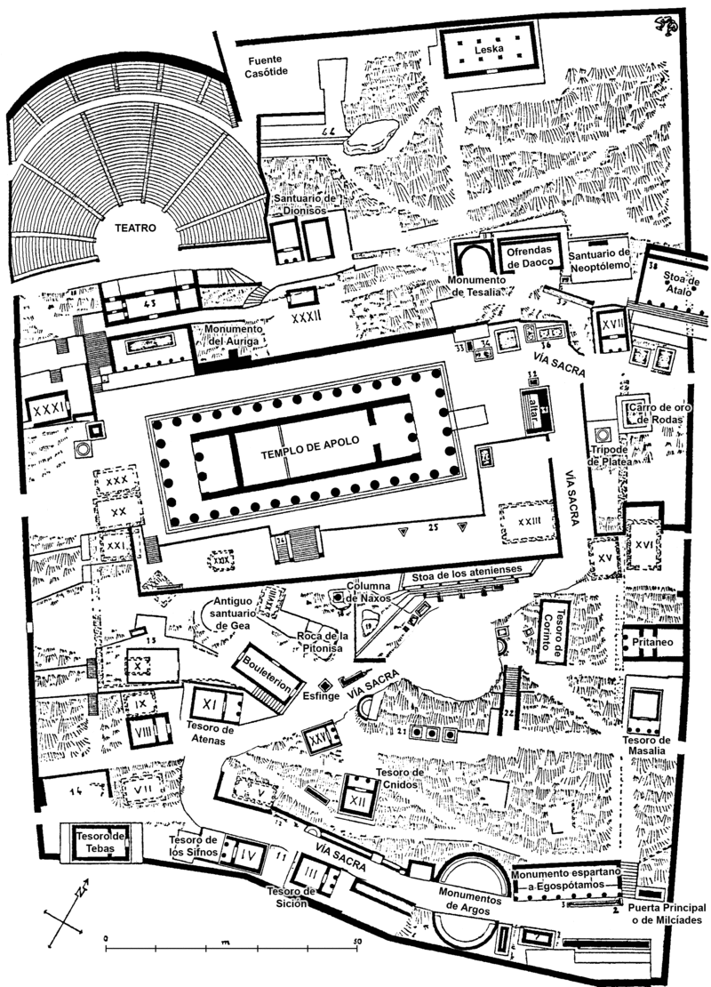 Plano del recinto arqueológico de Delfos Las ruinas del Templo de Apolo en Delfos, que se remontan al siglo IV a. C., pertenecen a un templo dórico periptero. Fue edificado sobre los restos de un templo anterior, fechado en el siglo VI a. C., que a su vez fue erigido en el emplazamiento de otro del siglo VII a. C. Su construcción se atribuye a los arquitectos Trofonio y Agamedes. |